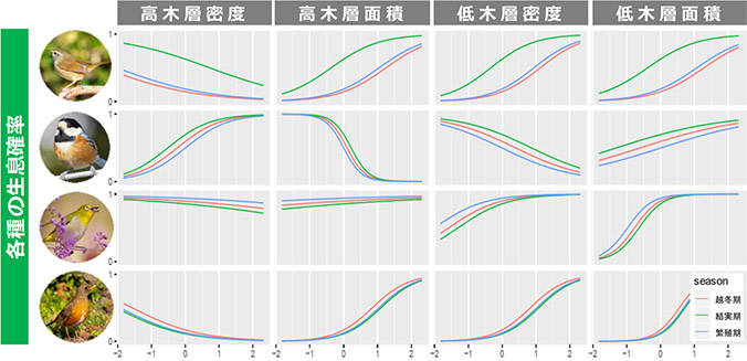 鳥種別 各環境要因が生息確率に与える影響評価(生息地モデル)