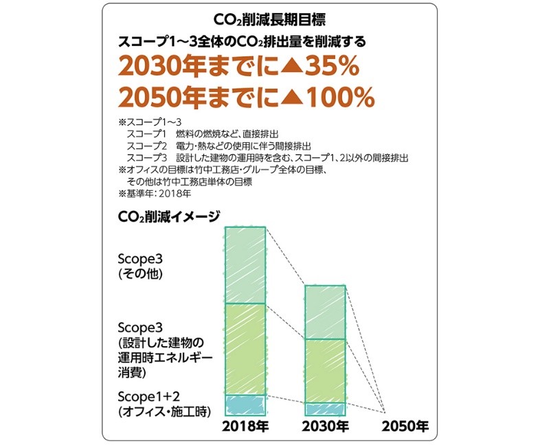 竹中工務店は、これまで長期目標を「2050年に80%削減」と定めていました。しかし、急速に加速しつつある世界の動きを受け、「100%削減」と改定。目標を大幅に上げました。