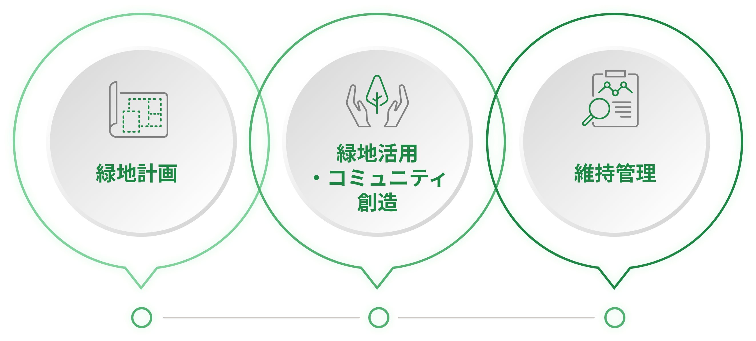 まずは敷地スケールの取り組みを増やしていき、面的に拡大させていくことで、より効果的で価値の高い自然と共生した街まちやエリアの創生に繋がります。