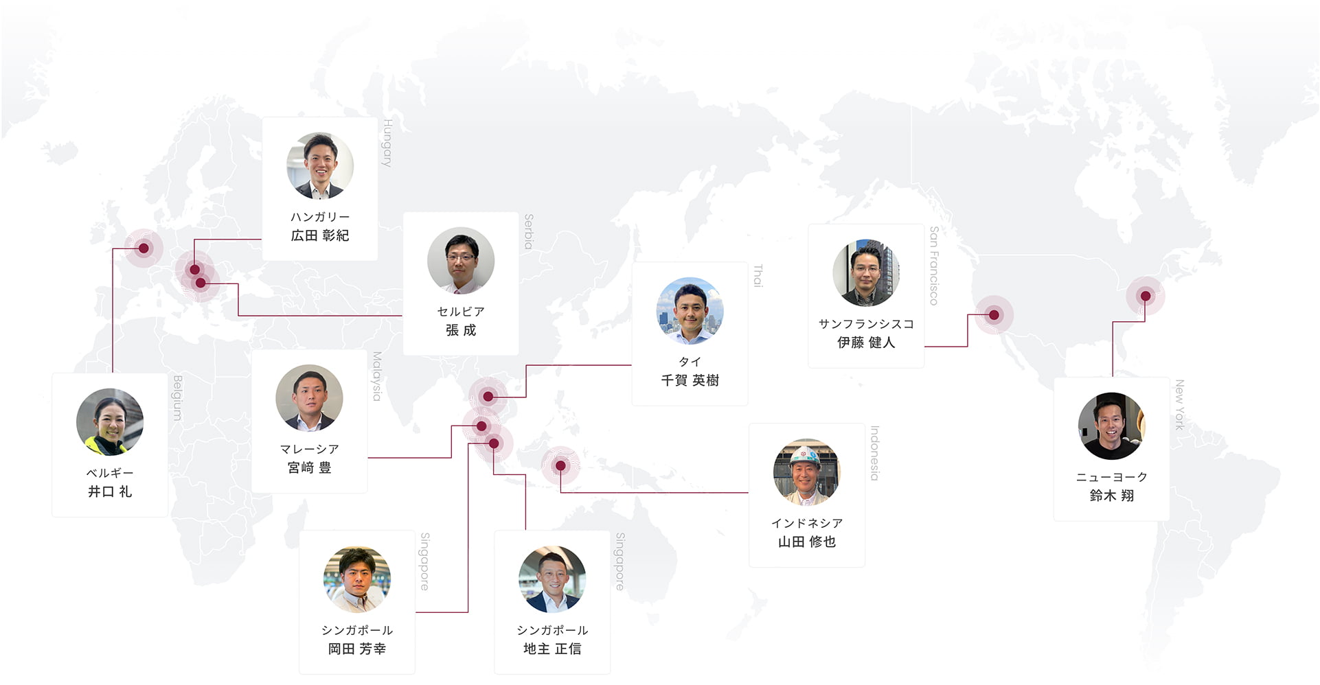 世界各国の特有の文化の中で、竹中工務店で培ったノウハウを活かしながら、様々な社員が活躍しています。 アジア タイ千賀 英樹 マレーシア宮﨑 豊 インドネシア山田 修也 シンガポール岡田 芳幸 シンガポール地主 正信 ヨーロッパ セルビア張 成 ベルギー井口 礼 ハンガリー広田 彰紀 アメリカ サンフランシスコ伊藤 健人 ニューヨーク鈴木 翔