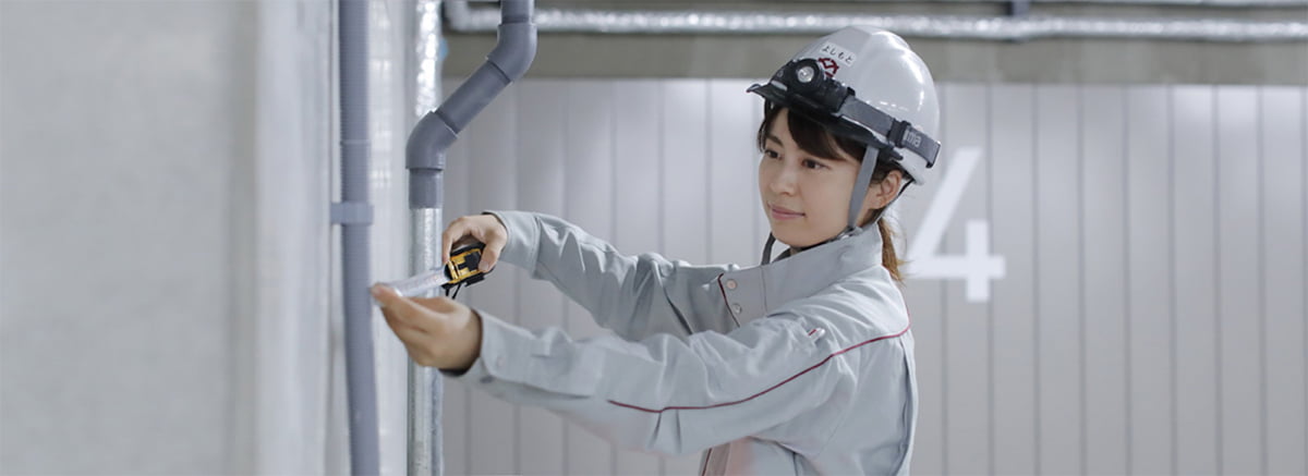 設備分野の施工管理担当は若手の頃からお客様の前に立ち、要望を伺いながら提案や調整・施工を行います。大きな責任が伴いますが、その分やりがいも大きく、現場の最前線で働き、お客様の満足されている様子を間近で見られるのは、この仕事の醍醐味のひとつです。今後の目標は、プロジェクトに関わるすべての人から「また吉本さんと一緒に仕事がしたい」と思ってもらえる技術者になることです。建築担当との間の調整も重要な業務なので、建築関連の知識を深め、より高品質で施工力の高い作品づくりを目指していきます。また、将来的には仕事と家庭を両立し、女性技術者として自分らしい働き方を見つけ、この仕事を続けていこうと考えています。