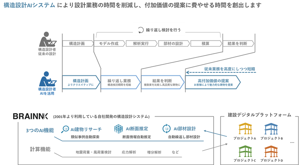 集積された構造部材の諸情報を「構造設計AIシステム」に学習させ、「BRAINNX」の機能として実装することで、設計業務期間における計算作業に使う時間を大幅に削減します。