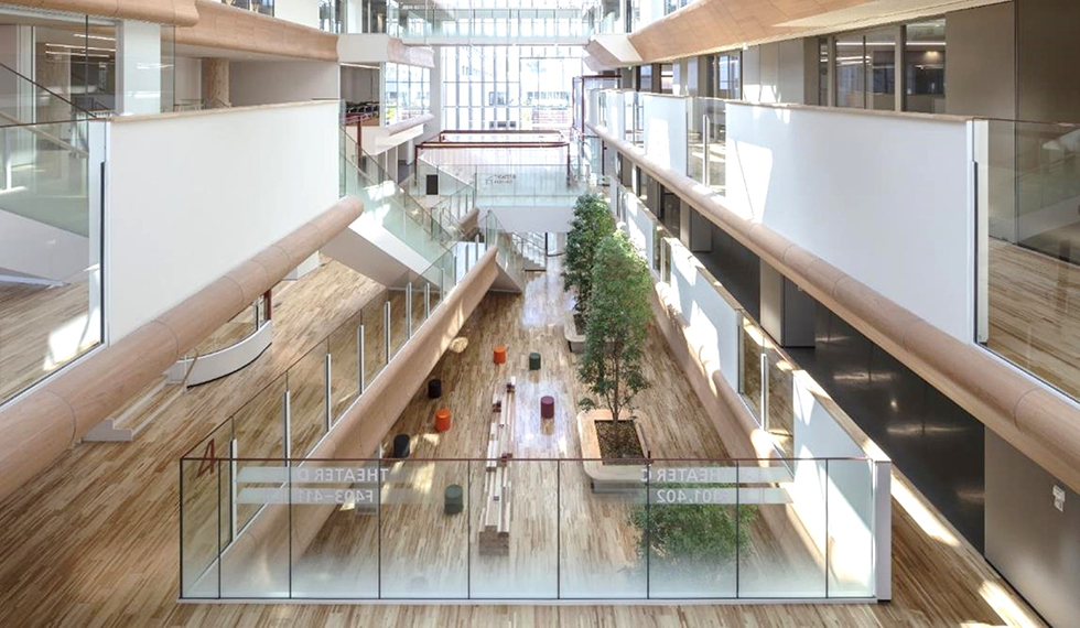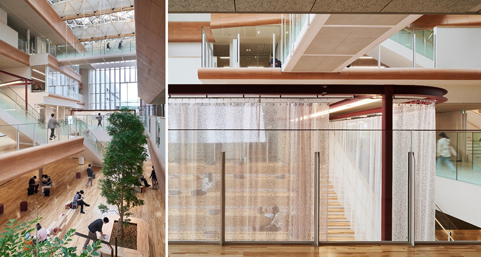 トップライトから木漏れ日のような光が降り注ぐアトリウムの「フォレストプラザ」は木のぬくもりが感じられる居心地のよい半屋外的な空間で、集う人々の偶然の出会いや交流、自発的な学びを促します。