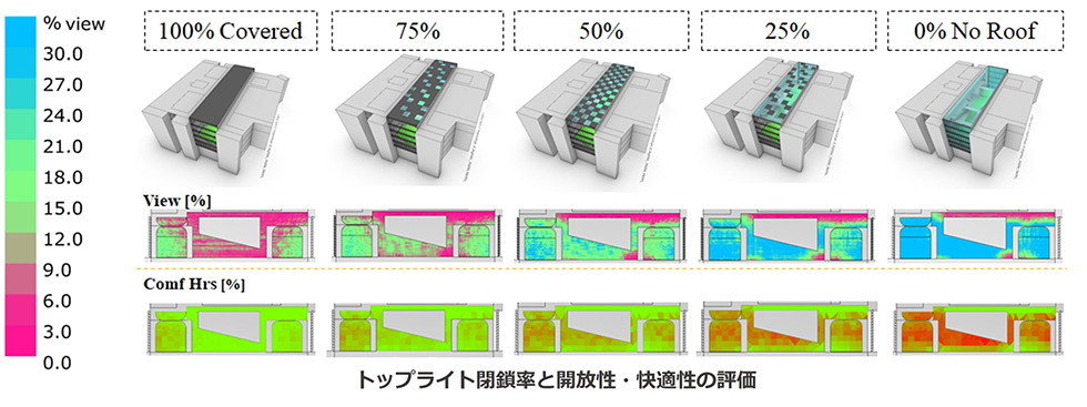アトリウムでは直射日光を制御し「温熱快適性」を維持しながらも、他方では青空が見え、光りが降り注ぐ「開放感」を最大化するという、相反する事象の最適化が求められました。