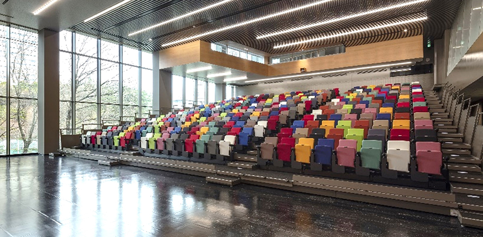 建設期間中に地球規模での新型コロナウイルス感染症が蔓延してしまい、キャンパスの入構制限、オンライン授業の普及など、世の中の大学の教育環境が激変する中、当初設計にはなかった提案も数多くいただいた。中でもアルゴリズム解析に基づき自動的にソーシャルディスタンスの確保可能となる多目的ホールの座席配色は、非常にユニークなものとして採用し、結果、学内外の話題を集めている。