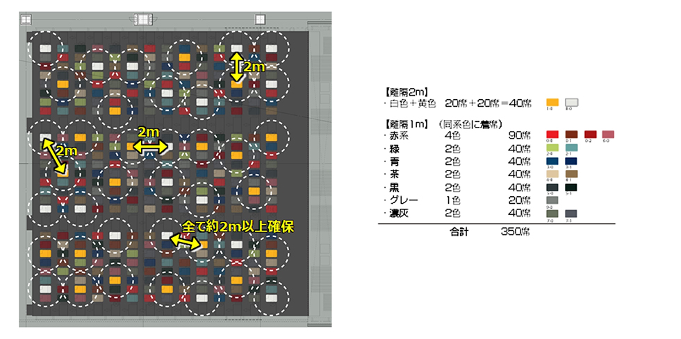 感染症に備え、安心して人々が集えるよう、350席を擁するホールでは座席配色を工夫しました。特定の色に着席することで、2mや1mのソーシャルディスタンスを自然に確保できる設計としています。(特許出願中)