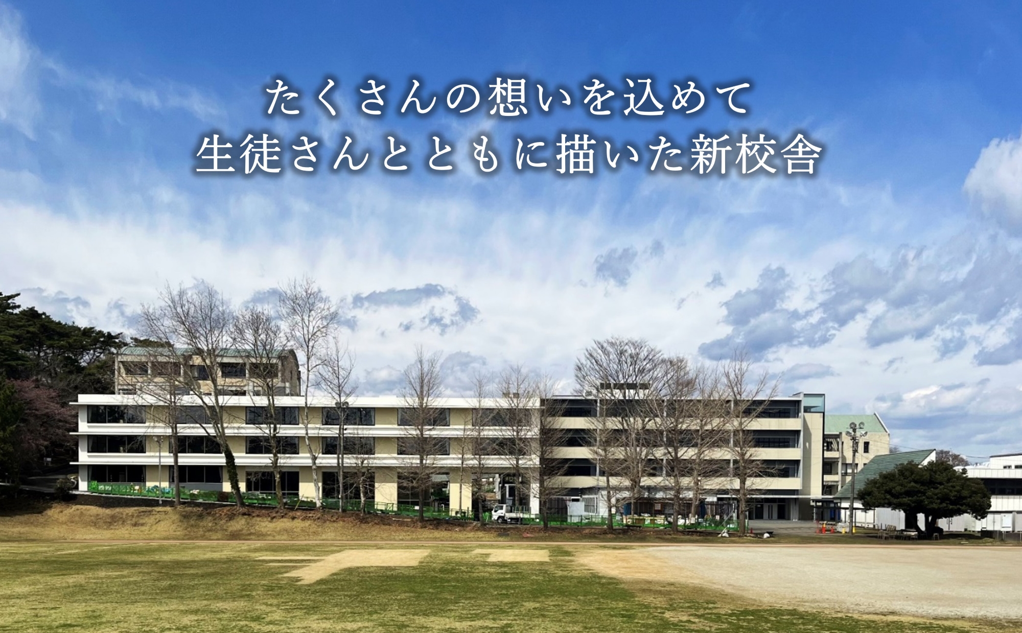 - 緑豊かな丘に建つ開放的な新校舎。既存のグラウンドや校舎との配置や動線を見直し、生徒、教員、地域、社会がつながる共用空間を創出しました。