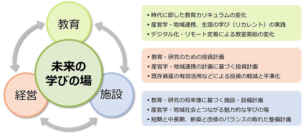 社会の変化は加速の一途をたどり、数年先が見通せなくなっています。未来のキャンパスがベストな形であるために、グランドデザインも一度策定して終わりではなく、常にブラッシュアップされていくことが必要です。