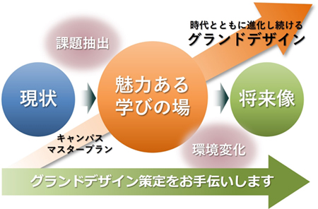 私たちは、最初のグランドデザインを「お客様との協働による課題抽出」と考え、策定後も、社会環境の変化に応じて進化し続ける学校のために、ともに歩み続けます。