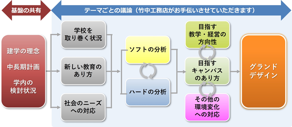 私たちはこれを「グランドデザイン」と呼び、未来の学校の「ありたい姿」をともに考え、教育・経営・施設が三位一体となってかたちにする未来の学びの場を描いて行きたいと考えています。