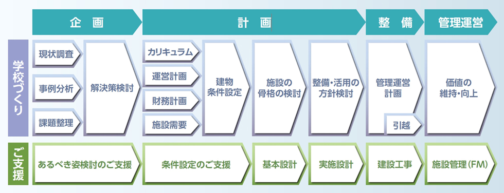 将来構想策定では、学校の建学の理念や教育方針、教育行政の変化とそれに伴う教育環境の変化、学校の財政の3つが大切な要素です。 私たちは、これらの3つの要素を大切にしながら、学校関係者へのアンケートやインタビューにより学内の施設ニーズや意見を伺い、学校の施設計画に必要な基本構想としてまとめ、施設に反映させていきます。 また、国などの補助金活用も含めた学校の事業計画についてもご相談下さい。