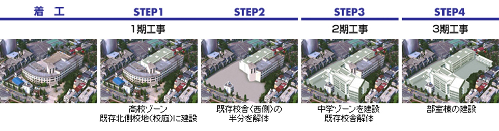 東京都心の閑静な住宅地にある中学・高校校舎の建替を行いました。難しい敷地条件の中で、学習環境低下の回避や経済性を考慮し、既存校舎を使いながら、新築と解体を繰り返して、3期にわたる工事を安全に進めることができました。