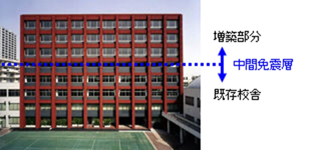 老朽化した校舎の建替に当り、既存校舎の上部に教室を増設するという構想に至りました。RC造の既存校舎の柱・梁に一体化させたRC造の柱・梁を増設、その柱上に、免震装置を設置した上でS造の増築部分を載せる構造としています。