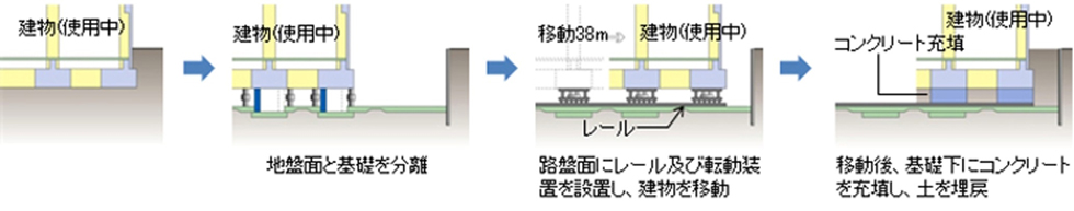 学校側の「プレハブ仮校舎を設置せずに生徒たちの思い出の校舎で卒業させたい」という強い想いに応え、歴史的建造物を残す為に用いられる「曳き屋」の手法を利用し、既存校舎(鉄筋4階建・2500t)を移動して、仮設利用しました。