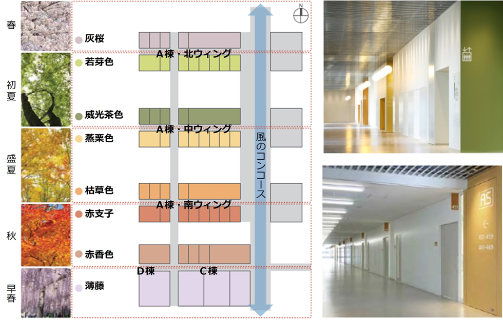 A・C・D棟は南北の各ゾーンの壁・サイン・家具に、四季のテーマカラーを採用している。テーマカラーにより視覚的に位置の把握がしやすい構成としている。