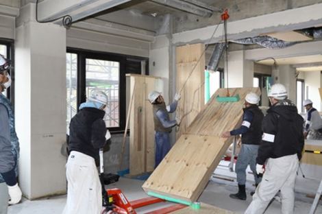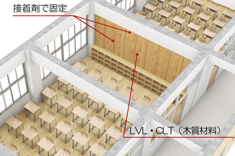 人力で搬入可能な木質材を用いた乾式工事のため、短工期で騒音が少なく、校舎を使いながらの改修が可能です。