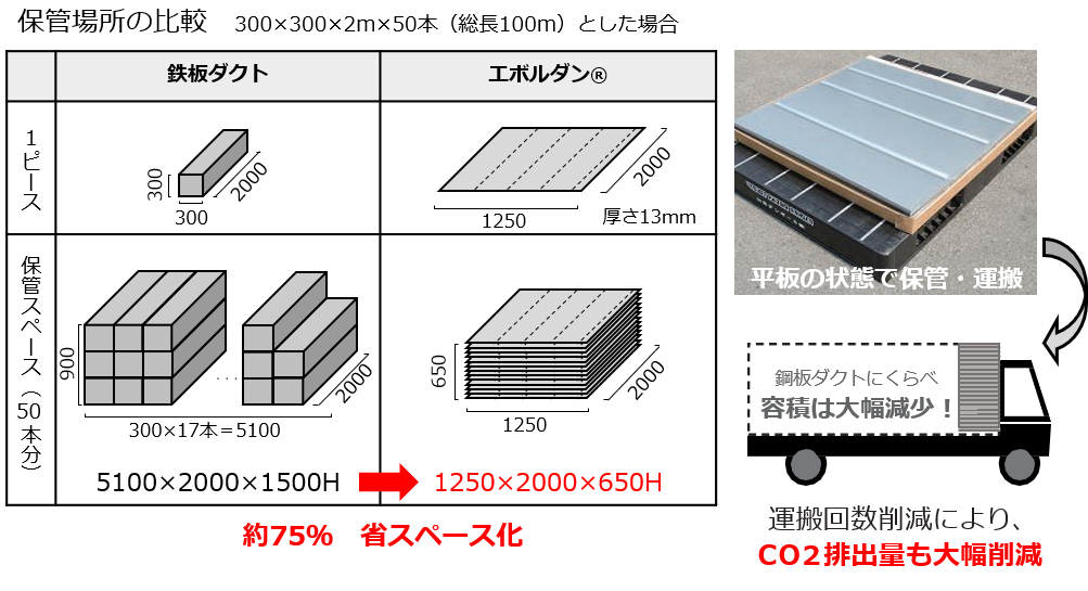 エボルダン®は平板のまま現場に搬入し、必要なときに折り曲げて組み立てられるしくみになっています。従来の鉄板ダクトに比べると、約75%も省スペース化が可能です。