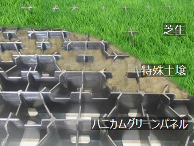 「ハニカムグリーン」はこの課題を解決した、駐車場や歩道などを芝生で緑化する技術です。