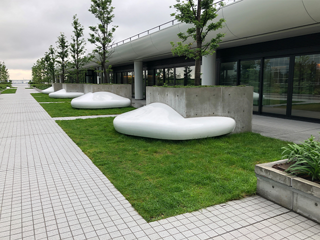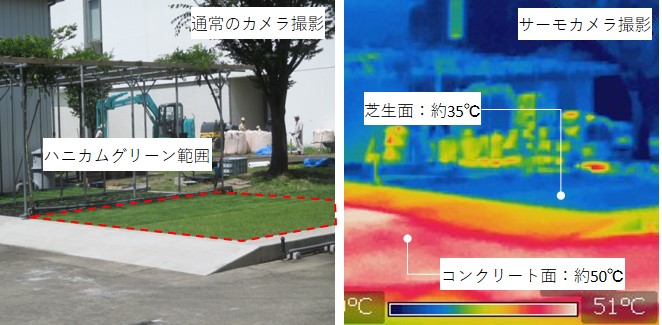 快適な屋外空間を生み出すグリーンインフラです。舗装面を緑化することで地表温度を大幅に抑え、雨水を保水する効果も期待できます。実際に夏季の測定では、「ハニカムグリーン」を施工したエリアは通常のコンクリート舗装に比べ、表面温度が約15 ℃も低いことが確認されました。