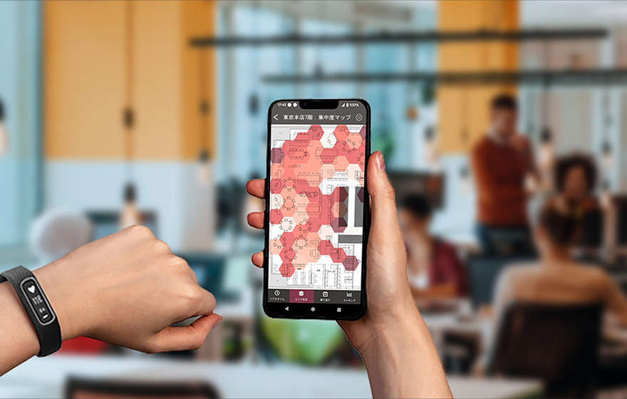 心拍計機能を搭載したリストバンドと屋内位置情報を計測する専用のスマートフォンを身に着けるだけのシンプルなシステム構成で、利用者は日々の業務、活動にストレスなく生体情報と位置情報を計測することが可能です。