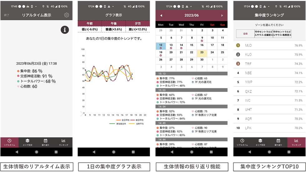 心拍データを基に推定した集中度、ストレス度、活力度等の心身の状態指標をリアルタイムに確認できるほか、その時の心身状態に合わせた働き方や執務場所を理解することができます。