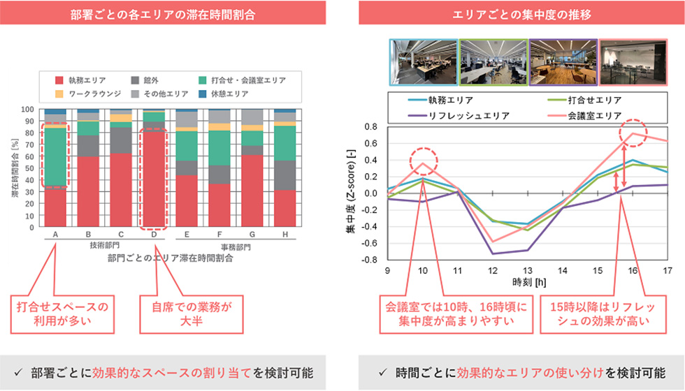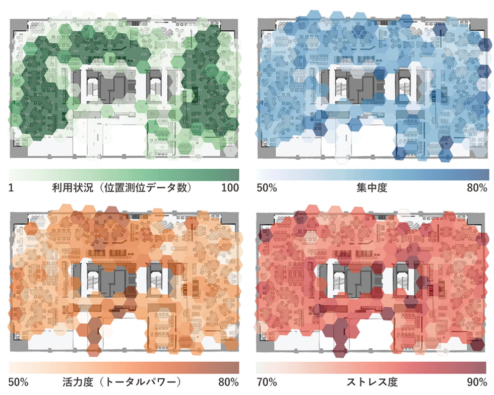 生体情報と位置情報を紐づけ、個人を特定できない粒度で利用者の様々な心身の状態指標をマップ上に可視化し、オフィスの環境改善に向けた課題把握が可能となります。また、部署ごとのエリア別滞在時間割合やエリアごとの集中度推移を把握し、部署ごとの業務特性に合わせた空間の使い分け等を検討することで、組織の更なる生産性向上に貢献します。