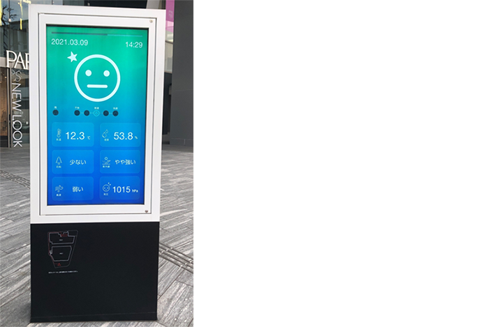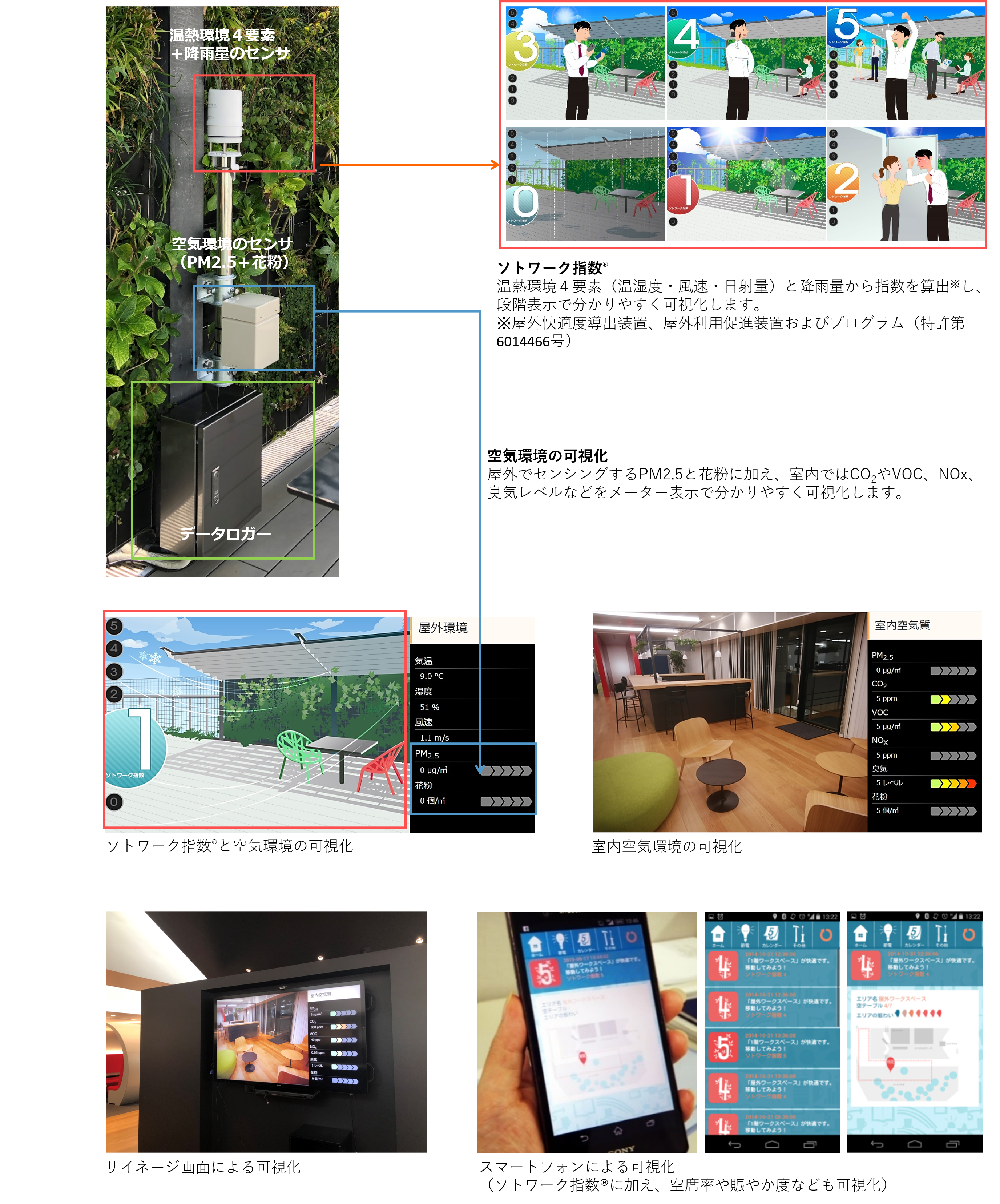 空間に設置した温湿度・風速などのセンサからリアルタイムに送られるデータをもとに、屋外の花粉飛散量や室内のCO2濃度などを可視化するとともに、ソト空間の温熱快適性を示す「ソトワーク指数®」を算出し、デジタルサイネージやスマートフォンなどに表示します。