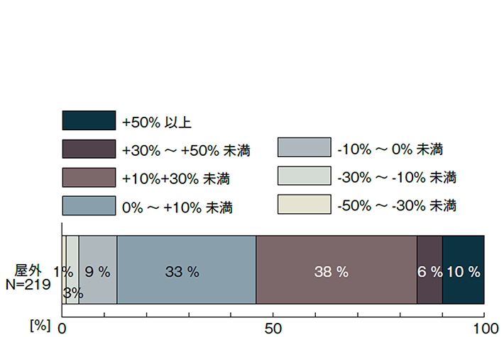 本システムの効果を把握するため、オフィスワーカーを想定した32人を対象とした被験者実験を実施しました。発想力やコミュニケーション活性度を測るテスト(「新しい〇〇(例、イスや枕、ハンガーなど)を考えてください」という問いに対して、被験者に制限時間内に何個でも自由に回答頂き、その結果で“被験者による自己評価”と“実験者による客観評価”を実施しました。回答の質は「新奇性」と「適切性」をそれぞれ0(全くない)~4(非常にある)の5段階で採点し、2者の和がその解答の「創造性」を示すものとしました。)では、一般的な屋内執務スペースに比べて、屋外コミュニティスペースでは成績が向上する傾向になりました。また、アンケート結果では、過半数の利用者が屋外コミュニティスペースの利用で知的生産性が向上したと回答しました。