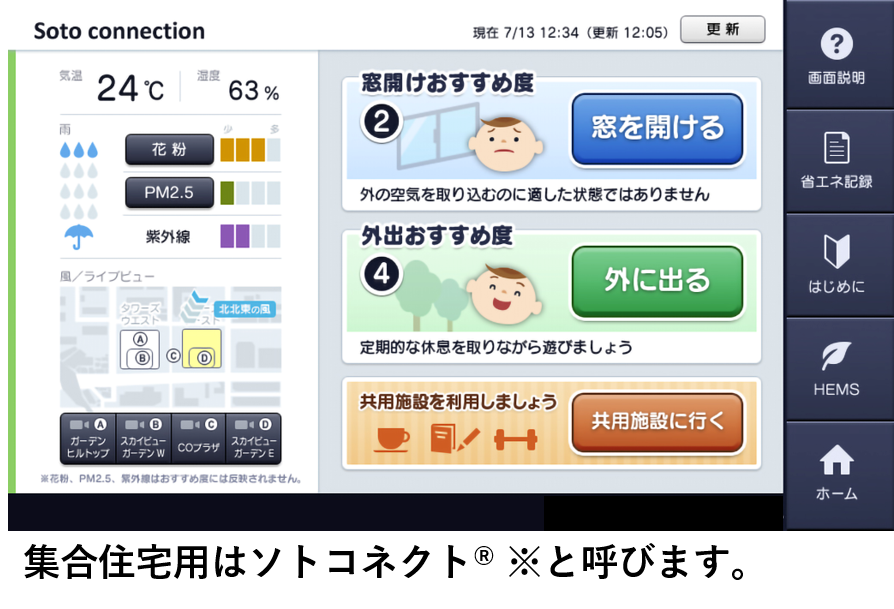 - 住戸内などの表示装置に分かりやすく見える化して窓開け行動や外出行動を促進し、エコで健康な生活をアシストするシステム。