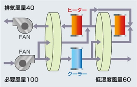 低温再生可能なデシカント式ドライ空調機にヒートポンプを組み込みランニングコストを低減します。