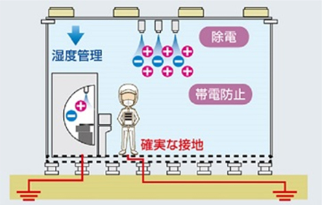 電子デバイスや先端材料の製造環境に必要な静電気対策を提供します。仕上げ材の帯電防止、イオナイザ設置や湿度管理、アースなどの対策検討から、検証測定まで対応します。