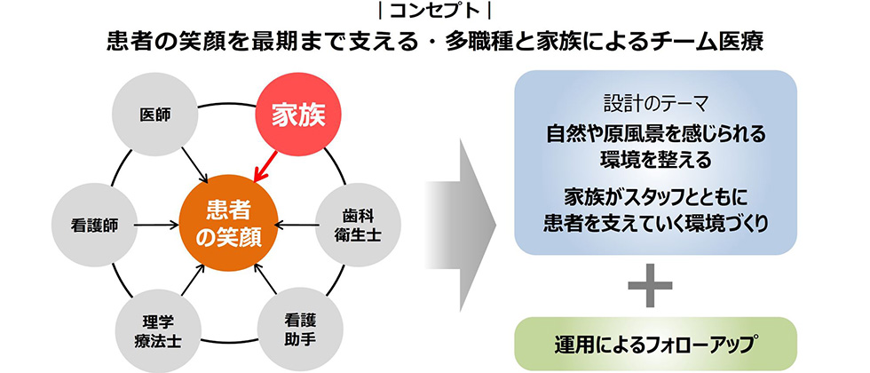新病院の計画にあたっては「患者の笑顔を最期まで支える」「多職種と家族によるチーム医療」をコンセプトに掲げました。限られた予算やスタッフ数で患者さんを最期まで支えていくためには、家族も一員となる療養型チーム医療が重要であると考えたからです。