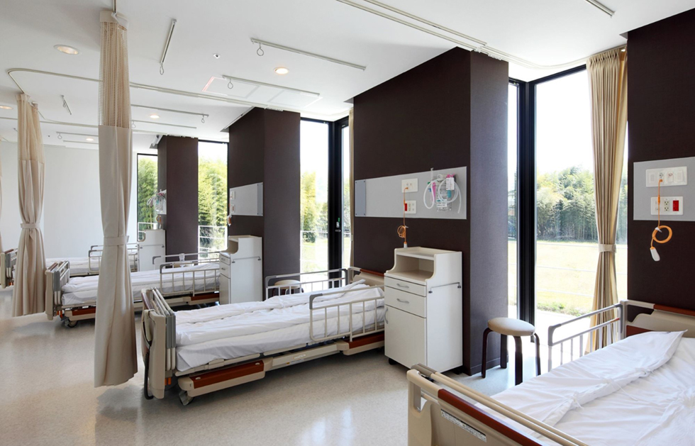 療養型病院では看護配置が20対1(患者20人に対して看護師が1人)と少ないため、正方形の病棟の中心にスタッフステーションを配置し、どの病室にもすぐに行くことができるように工夫しました。また患者さんの様態に応じた4種類の病室タイプを取り入れました。