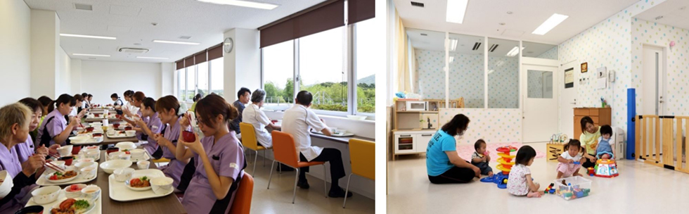 患者さんの療養環境が優先され、従来はスタッフのスペースは削られがちでしたが、少ない人数で患者さんを支えるスタッフにも快適な環境を整備していくことが、より良い医療を提供する上で重要であるという考えから、眺めの良い最上階にスタッフ専用の食堂や会議室を設けてリフレッシュできる環境を整備しました。また1階にはスタッフが子どもを預けられる託児室も整備しています。