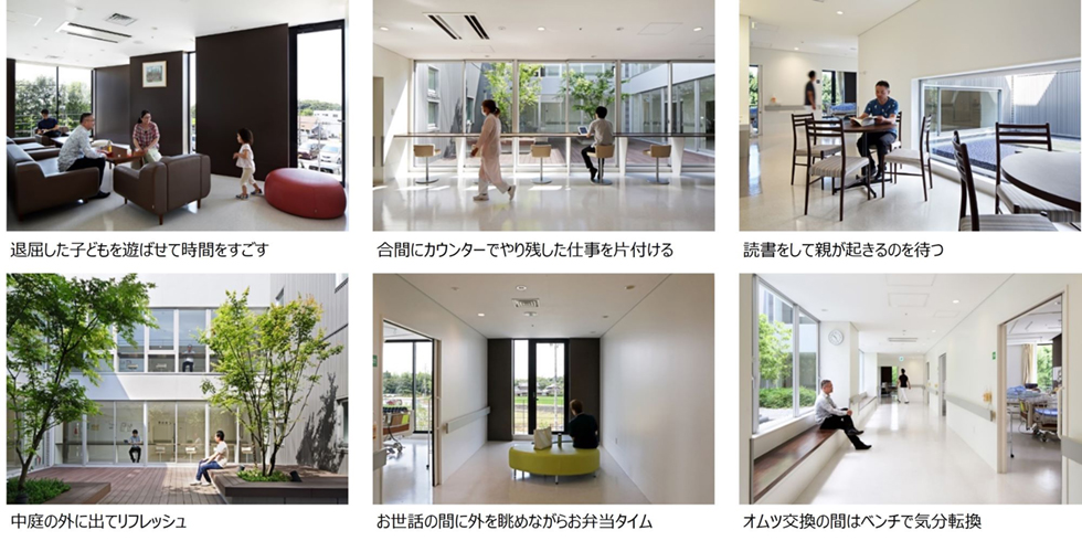 そこで設計のテーマとして、患者さんが自然や原風景を感じられる環境を整えること、そして家族との時間を長く過ごせるように、お見舞いに来やすい環境を整え、家族がスタッフとともに患者を支えていく環境をつくりだすことを目指しました。