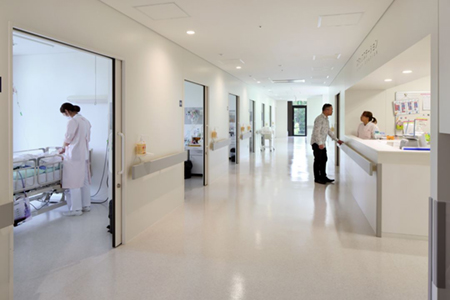またスタッフの視点でも、廊下側に2か所設けた出入口から病室内の観察がしやすく、ベッドでの搬送も容易に行うことができます。