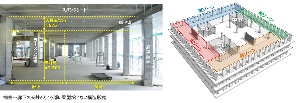 また、耐震要素の大部分を外周部の扁平壁柱に負担させることで、中央架構部のプランニングの自由度が向上し、中庭の分散配置も可能になりました。