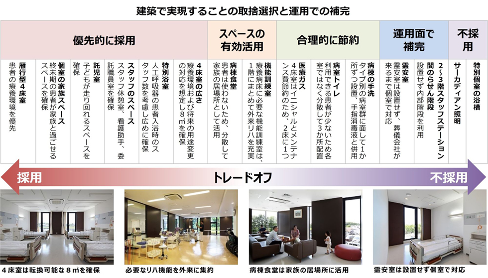 比較的コンパクトな療養型病院においても、1床当り40㎡という床面積は最低限の水準であるため、設計過程では様々な選択肢を緻密に判断し、優先度の低いものは代替案や運用での補完を検討することにしました。