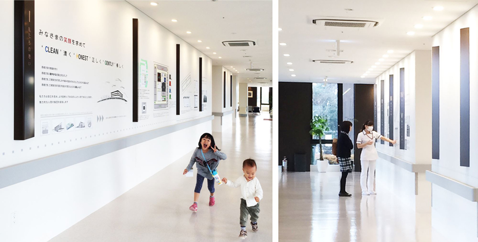 1階外来の壁面には病院関係者と設計者が新病院に込めた想いを表現したコンセプトウォールを設置しました。患者さんの家族に病院のことを理解してもらう、採用面接で訪れたスタッフにも病院の考え方を説明するなど、様々な場面で活用されています。