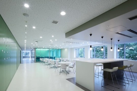 設計コンセプトの今1つは、「臨床・研究・教育の融合の場としてのスタッフエリア」です。スタッフが職種を超えて連携し協業するため、これまでは個々の部門ごとに分かれたスペースで行われていたアクティビティを、共用の場で行えるように計画しました。この共用の場には、さまざまな仕掛けが用意されています。