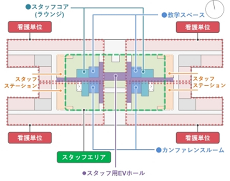 病棟部門においてもクラスター診療の効果を最大化するために提案したのが、1フロアに4看護単位を配置する「メガフロア病棟」です。南北の2看護単位のスタッフステーションを連続的に配置して一体的な運用を可能にし、さらに東西もスタッフモールでつないで、4看護単位間の連携が取りやすい計画としています。また、バックヤードであるスタッフエリアは中央に集約し、スペースの合理化を図っています。これにより、スタッフが患者さんや家族の目に触れずに利用できる専用スペース「スタッフコア」や、学生用の実習室など、交流や休息、活動のための空間を生み出しました。これらも、クラスター診療に不可欠な診療科間や職種間の連携を促しています。
