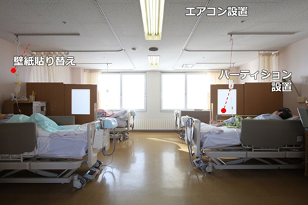 茨戸病院(北海道)では、介護療養病棟を新しく創設された介護医療院に転換するため、当社の病院建築専門スタッフが様々な課題をお客様と一緒に解決しながら改修工事を行いました。