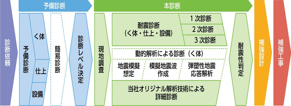 医療施設の耐震診断は、まず予備診断で診断レベルを決定し、本診断で躯体から設備に至るまで当社オリジナルの解析技術による詳細な診断を行います。