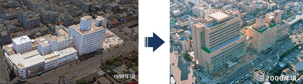 左が1990年頃の写真です。余裕のない敷地で、診療活動を続けながら効率のよい病院をつくるため、公道の廃止、複雑で高度な分割施工などの手法を用いて、困難な改築を実現しました。右が完成後の写真です。1998年に岡⼭済⽣会の「顔」とも⾔える、588床の新病院へと、ニューアルが完成しました。アースカラーの優しい⾊彩の病院は、岡⼭駅近くの新しいランドマークとなりました。