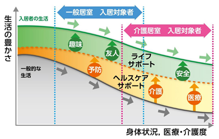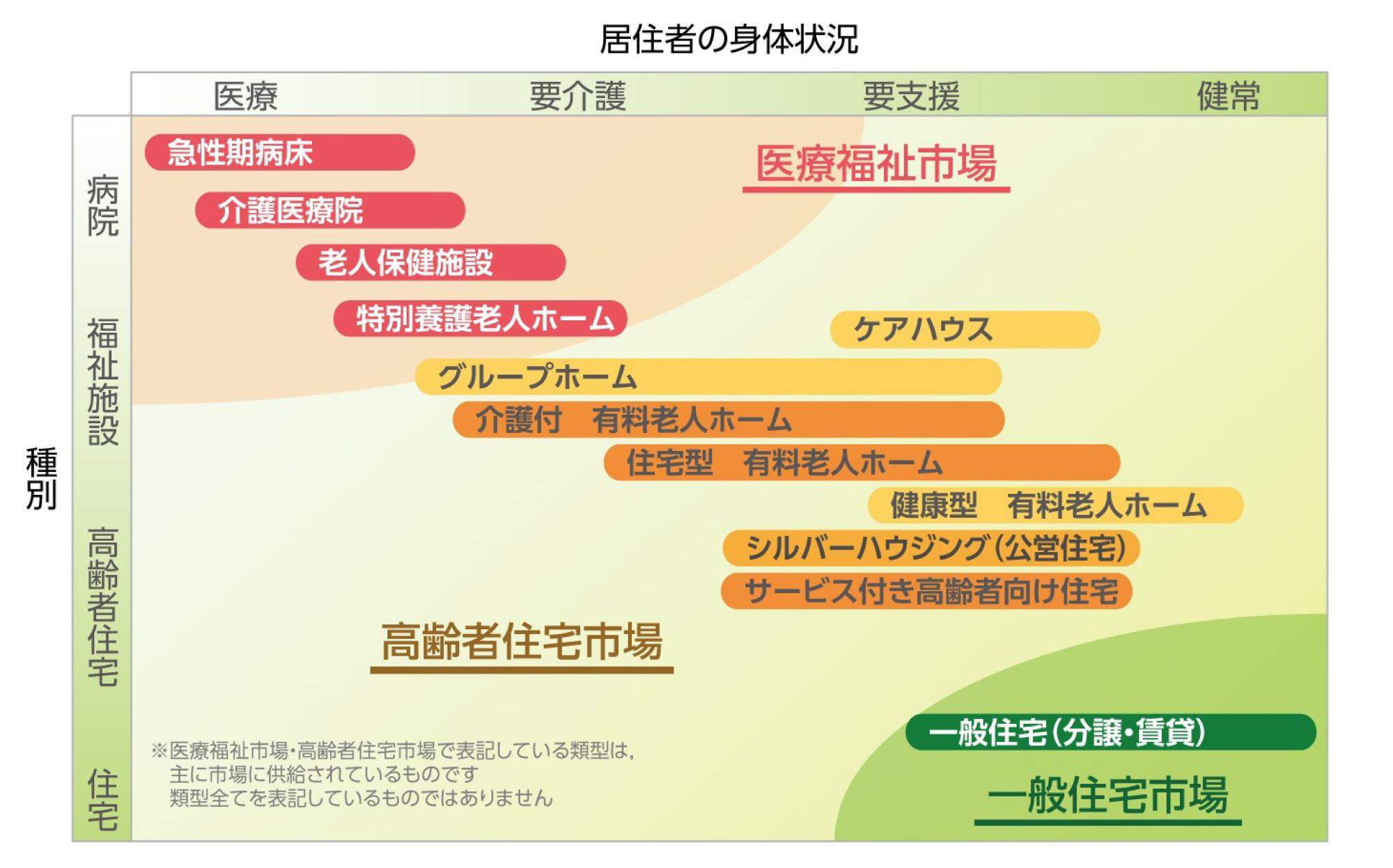 高齢者住宅は、図のように一般の住宅と医療福祉の中間に位置づけられます。居住者も元気な方から要介護の方まで幅広く対応しています。当社は市場や制度の動向をいち早くとらえ、お客様の事業にあった制度や企画をご提案します。