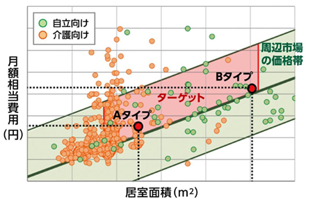 周辺市場の価格帯をポジショニング分析することで、ターゲットとする価格領域を明確にし、居室タイプごとの月額費用を設定しました。