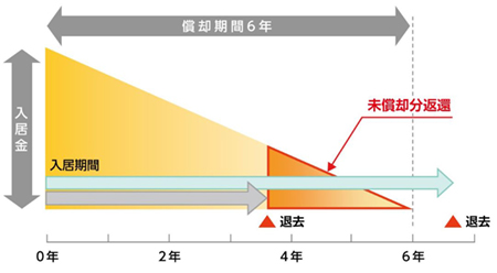 入居者は入居時に一時金を支払い、死亡時までの居住権を得ます。事業者は一定期間の償却期間を設け、入居者がこの期間内に退去した場合には、入居一時金から居住期間に応じた額を償却し、残額を返還します。