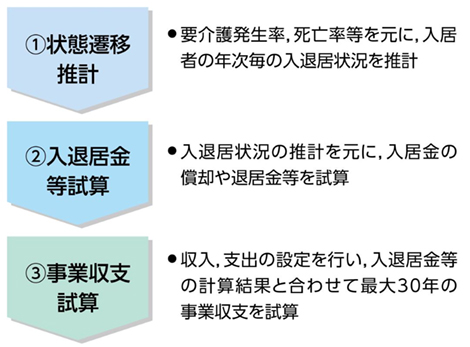 事業収支プログラム POPCOM-SMXは、利用権方式に対応した事業収支試算プログラムです。簡易生命表などの統計を基に、入所者の入退去状況を推計し、入居金の償却や退去金を試算します。これをもとに試算することで、利用権事業の30年間にわたる長期の収支を検証することができます。