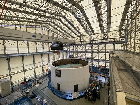 建物上部を覆う「移動式解体工場」が建物や煙突を解体しながら順次地上まで降りてくる。