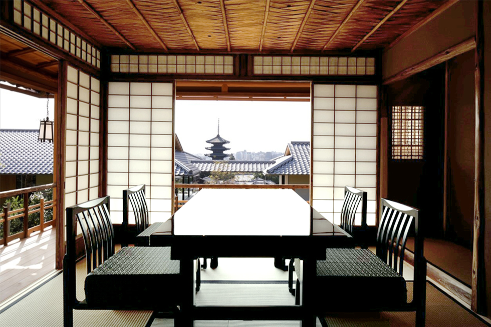 復元後の山荘 京大和「送陽亭」から八坂の塔をのぞむ。八坂の塔を眺める景観を損なわないよう、眼下のホテルのレストランとバーの位置、高さが決められています。
